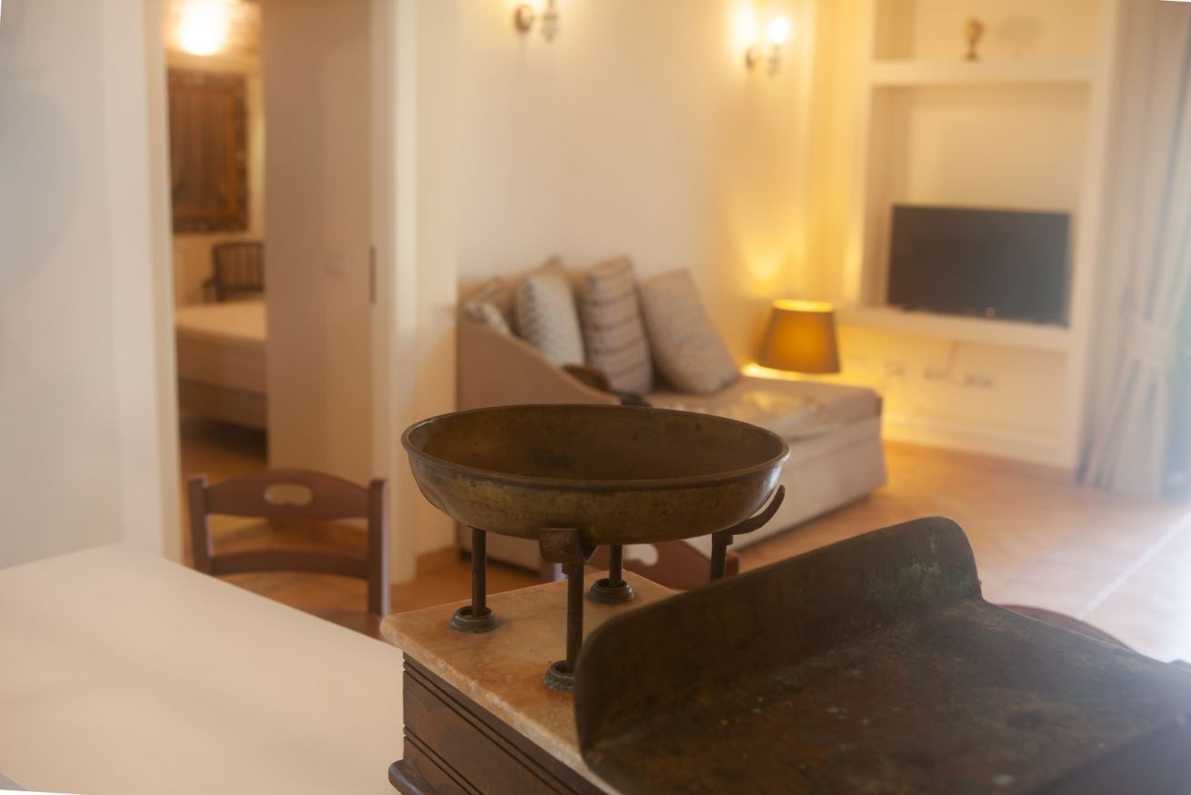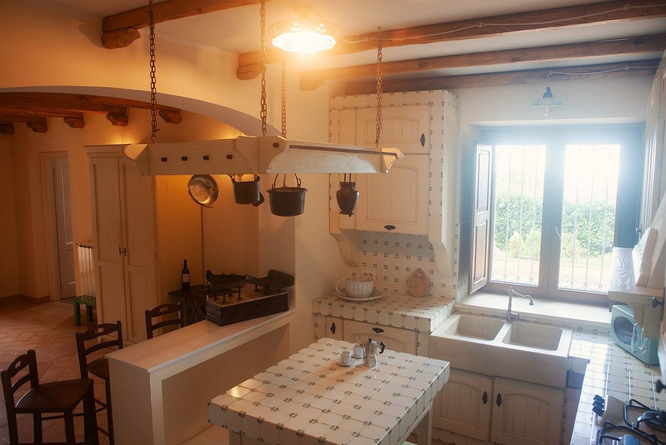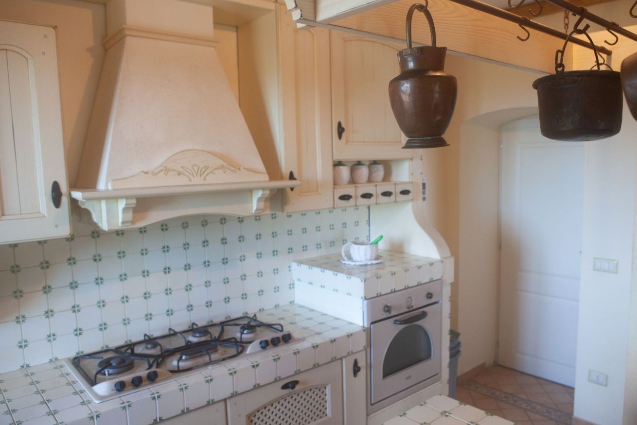 Una cucina in muratura nello stile dei vecchi casali, un ampio soggiorno luminoso con accesso diretto al giardino, una camera da letto. Al piano terra e' presente anche un bagno con doccia.