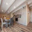 L'appartamento superiore è realizzato con materiali in legno, ha una cucina completa, due camere da letto e un bagno, inoltre le 5 camere da letto hanno la tv in ogni camera .